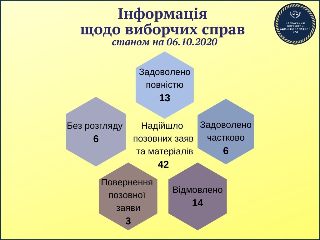Повідомляємо, що станом на 6 жовтня 2020 року до Черкаського окружного адміністративного суду подано 42 позовні заяви, що пов’язані з виборчим процесом.