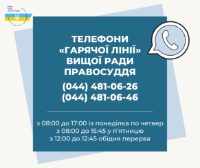 На період дії карантину телефонна «гаряча лінія» Вищої ради правосуддя працює щоденно (за винятком святкових і вихідних днів), із понеділка по четвер – з 08:00 до 17:00, у п’ятницю – з 08:00 до 15:45, обідня перерва – з 12:00 до 12:45.