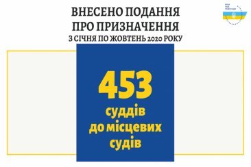 Вища рада правосуддя за десять місяців 2020 року прийняла рішення про внесення Президентові України подання про призначення на посади 450 суддів до місцевих загальних судів, 2 суддів – до місцевих господарських судів, одного судді – до місцевого адміністративного суду.