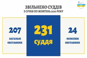 Із січня по жовтень 2020 року Вища рада правосуддя прийняла рішення про звільнення 231 судді. За загальними обставинами звільнено 207 суддів: 206 – у зв’язку з поданням заяв про відставку, 1 – у зв’язку з поданням заяви про звільнення за власним бажанням.