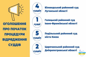 Вища рада правосуддя відповідно до рішень від 1 грудня 2020 року № 3326/0/15-20, № 3328/0/15-20, № 3329/0/15-20, № 3330/0/15-20 оголошує про початок процедури відрядження суддів до іншого суду того самого рівня і спеціалізації для здійснення правосуддя, а саме до: