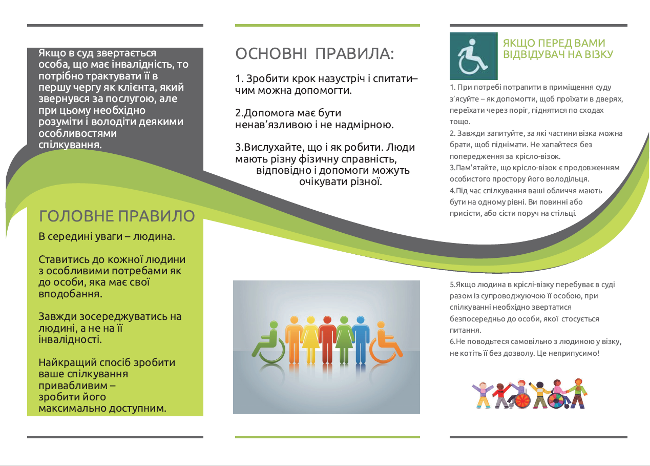 Щоб домогти працівникам судів краще розуміти особливості спількування з особами, які мають різні види порушень, розроблено та видано спеціальний буклет: ПРАЦІВНИКАМ СУДУ ПРО ОСОБЛИВИЙ ЕТИКЕТ