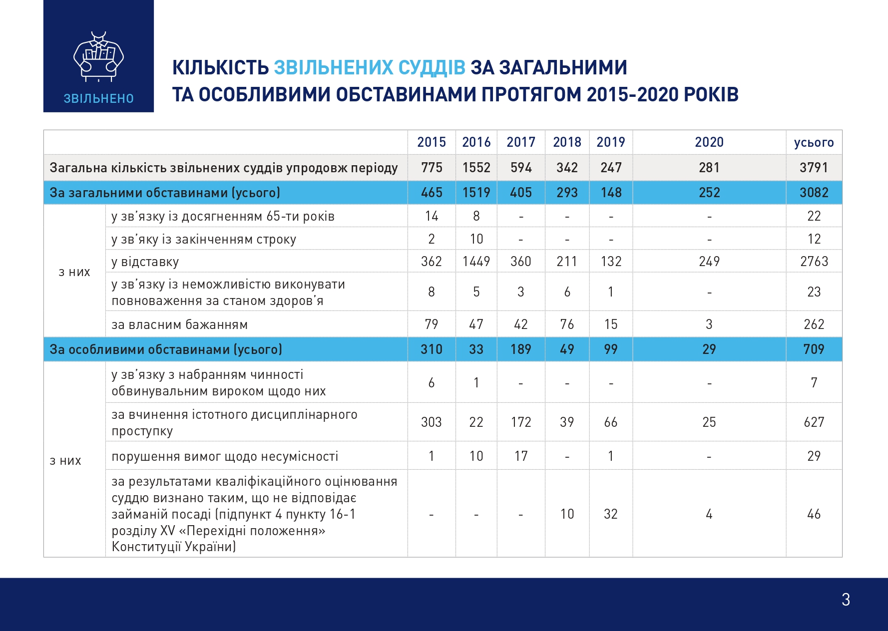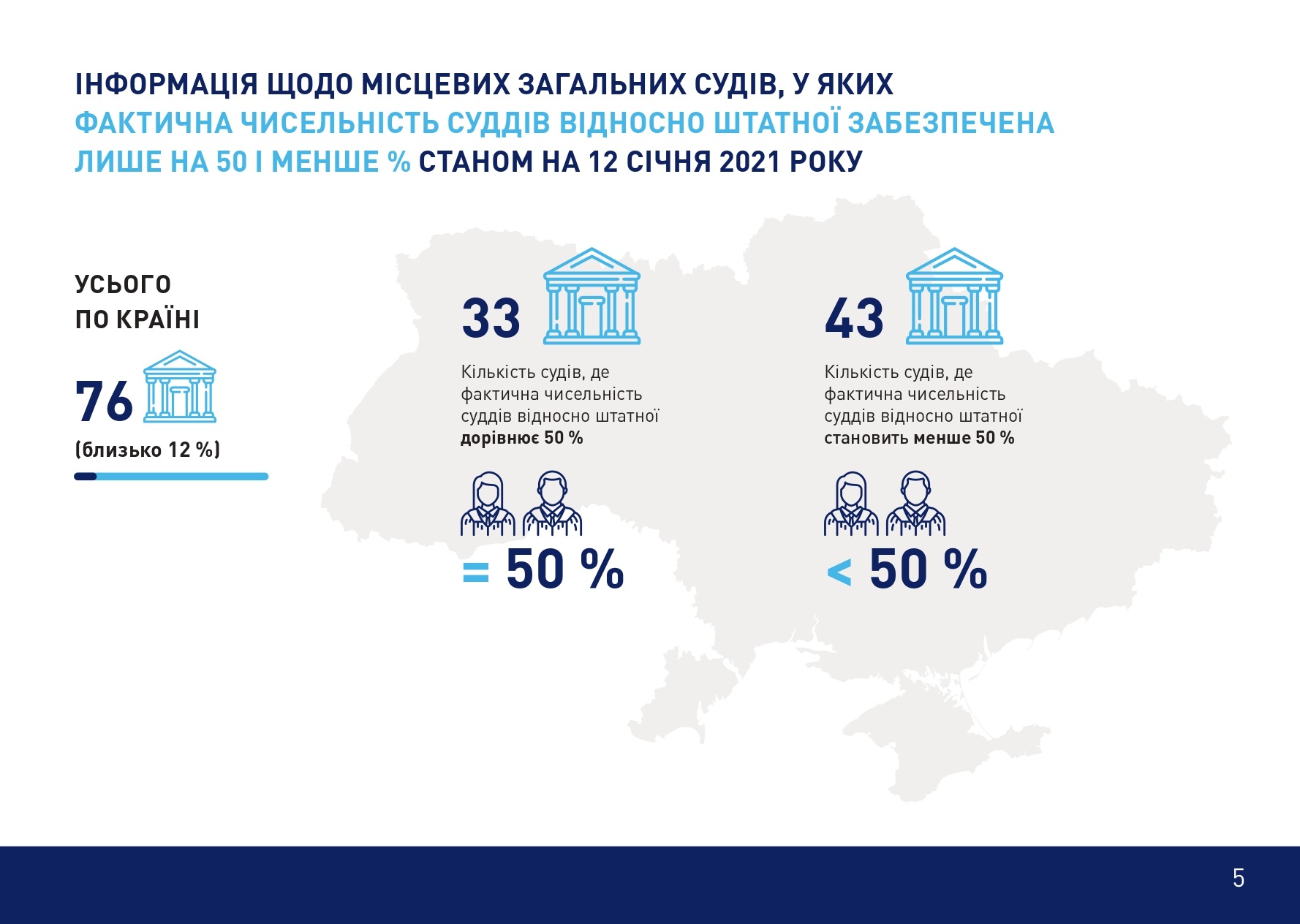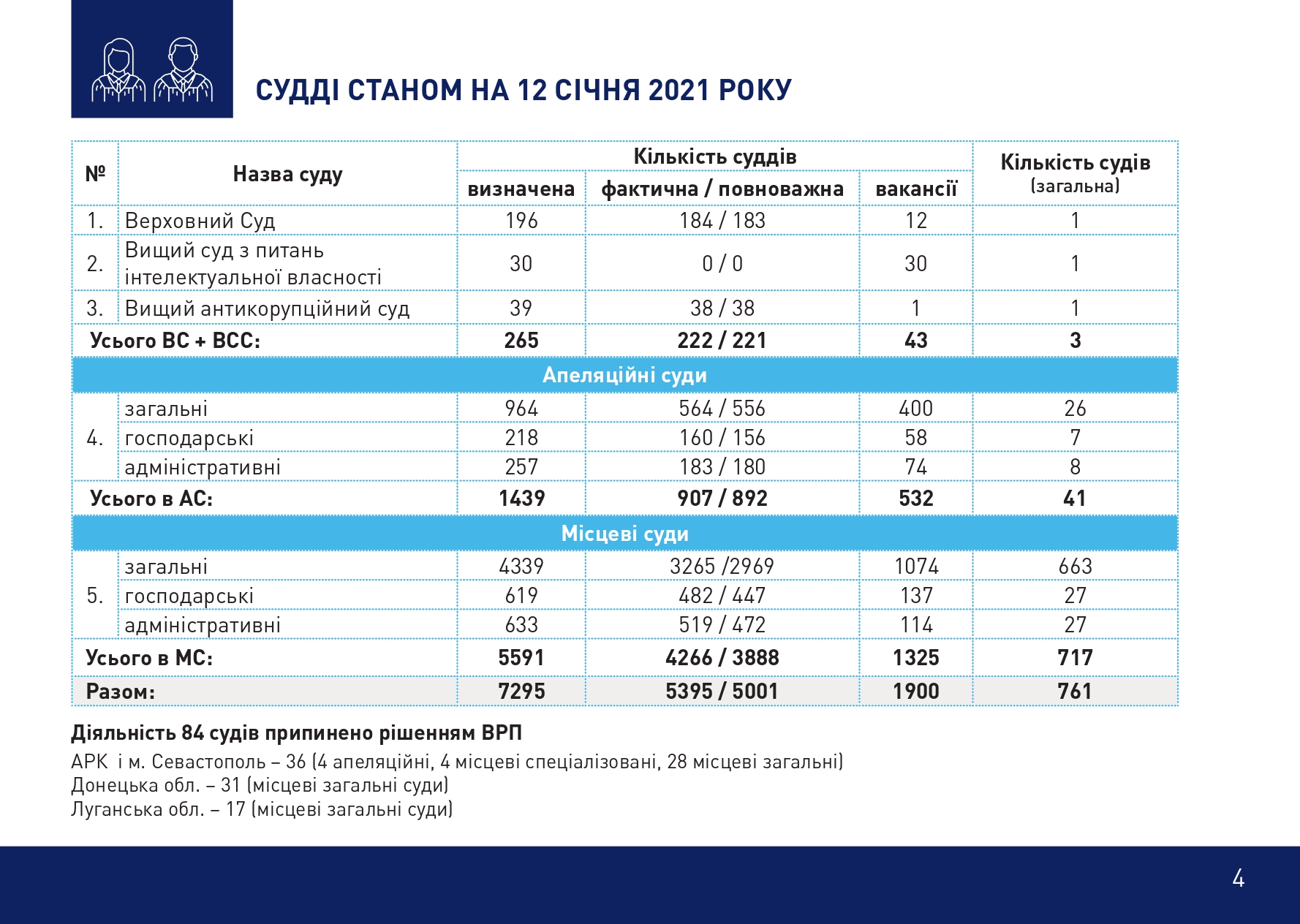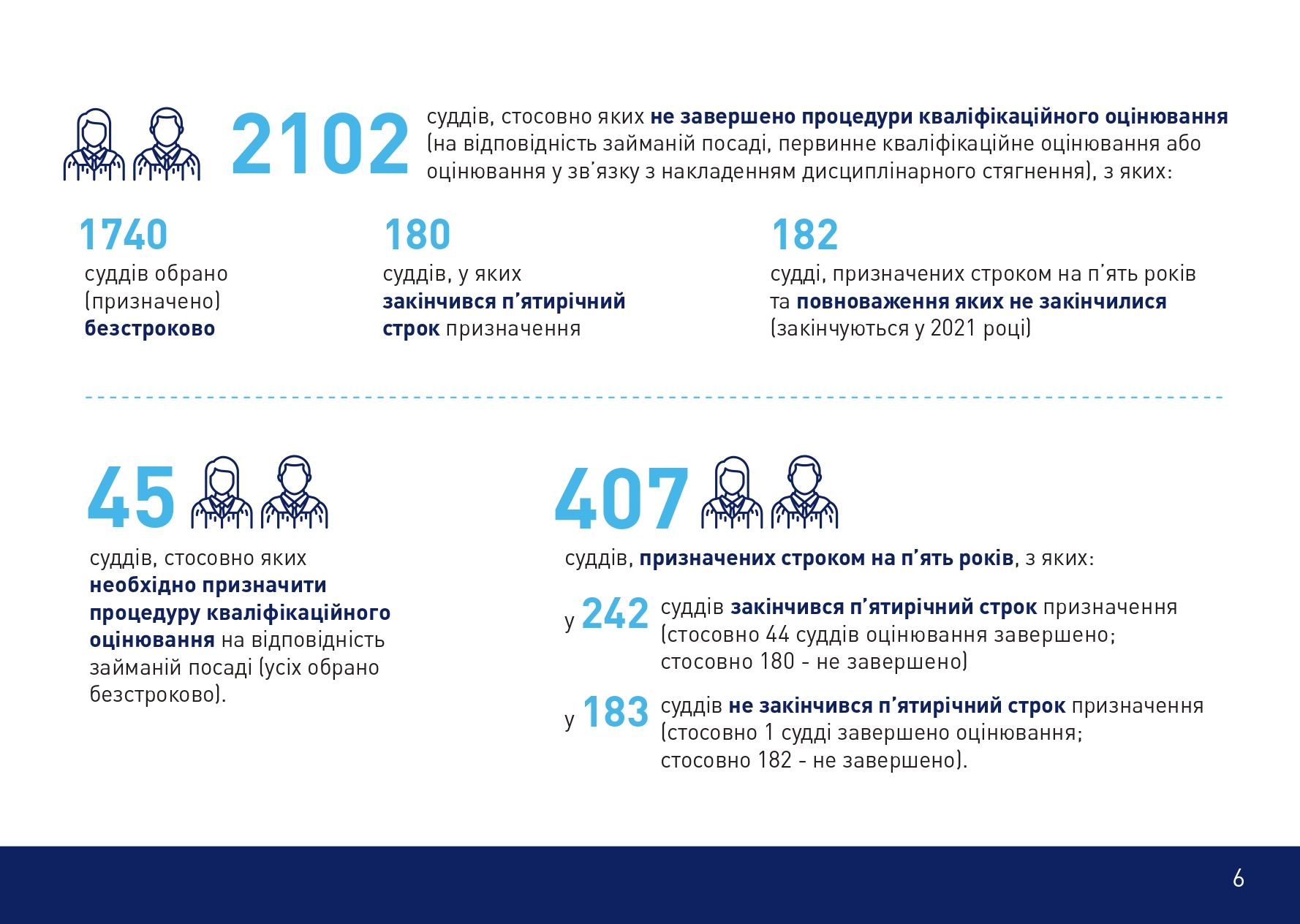 Олексій Маловацький окреслив динаміку кадрового забезпечення судової системи впродовж 2015–2021 років та навів актуальну статистику. «Зокрема, Вищою радою правосуддя ухвалено рішення про внесення Президентові України подання про призначення на посади суддів 2682 кандидатів. Станом на 12 січня 2020 року визначена кількість суддів становить 7295. Таким чином, якщо говорити про відновлення довіри до судової влади, з 2015 року майже половину суддів було змінено. Однак зараз цей процес фактично зупинений, адже не діє ВККСУ. Фактична кількість суддів – 5395, з яких 394 судді не мають повноважень. Загальна кількість судів в Україні – 761, при цьому 1900 посад суддів є вакантними. Тобто в кожному суді не вистачає майже 3 суддів. Саме ці показники демонструють реальний стан судової влади України на сьогодні», – повідомив Олексій Маловацький.