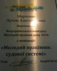 Працівник Київського апеляційного адміністративного суду Марченко Артем став переможцем у номінації "Молодий працівник судової систeми" у Всeукраїнському конкурсі "Молодий правник року 2016".