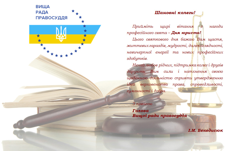 Від себе особисто та від Ради суддів України щиросердечно вітаю вас з професійним святом Днем юриста! Святом, що об'єднує усіх правників в єдину спільноту вартових Закону і Справедливості.