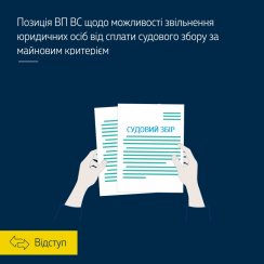 Із системного аналізу змісту норм зазначеної статті Велика Палата ВС дійшла висновку, що положення пунктів 1 та 2 ч. 1 ст. 8 Закону України «Про судовий збір» не поширюються на юридичних осіб, незалежно від наявності майнового критерію (майнового стану учасника справи – юридичної особи), а положення п. 3 ч. 1 ст. 8 Закону України «Про судовий збір» можуть бути застосовані до юридичної особи за наявності майнового критерію, але тільки у справах, визначених цим пунктом, тобто предметом позову в яких є захист соціальних, трудових, сімейних, житлових прав, відшкодування шкоди здоров’ю.