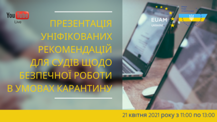 21 квітня 2021 року з 11:00 до 13:00 в онлайн-режимі відбудеться презентація та обговорення уніфікованих рекомендацій для судів України щодо безпечної роботи під час карантину, розроблених Вищою радою правосуддя спільно із Консультативною місією Європейського Союзу з реформування сектору цивільної безпеки України (КМЄС в Україні).
