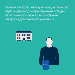 Надалі для отримання посвідки на постійне проживання на території України особа подала до ДМС України в одній з областей разом із заявою про надання дозволу на імміграцію та іншими документами і свій паспорт, усвідомлюючи, що раніше отримані нею відмітки про перетин державного кордону України не нанесені державним органом у визначеному чинним законодавством порядку. Після розгляду звернення вона отримала дозвіл на імміграцію в Україну, а згодом їй було надано посвідку на постійне проживання на території України безстроково.