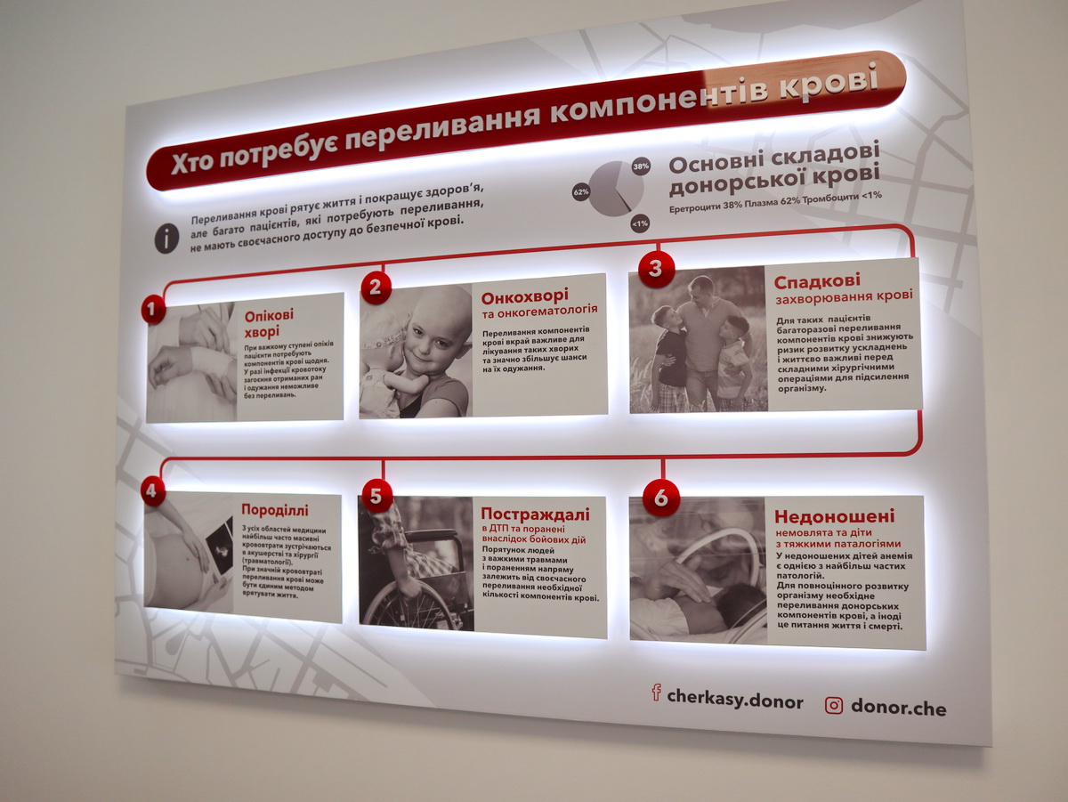 Донорська кров необхідна як для надання невідкладної допомоги, так і для планового лікування. Компоненти крові унікальні та незамінні, їх щодня потребують пацієнти у відділеннях гематології, хірургії, онкології, їх використовують в акушерстві, під час лікування поранених, проведення складних хірургічних втручань тощо.
