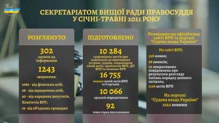 Протягом січня – травня 2021 року секретаріатом Вищої ради правосуддя розглянуто 1243 звернення: 1086 – від фізичних осіб, 98 – від юридичних осіб, 40 – від народних депутатів України та комітетів Верховної Ради України, 19 – від обʼєднань громадян, а також 302 запити на інформацію.