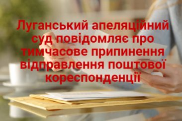 Луганський апеляційний суд повідомляє про тимчасове припинення відправлення поштової кореспонденції у судових процесах, а саме: запитів, необхідних для забезпечення розгляду справ (в тому числі для вирішення питання про відкриття провадження у справі), судових повісток, копій судових і процесуальних рішень тощо.