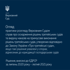 Пропонуємо до вашої уваги дайджест актуальних висновків Верховного Суду про оскарження рішень третейських судів та видачу наказів на примусове виконання рішень третейських судів, утворених відповідно до Закону України «Про третейські суди», якщо такі рішення ухвалені у спорах, віднесених до юрисдикції господарських судів (за період з липня 2020 по лютий 2021 року).