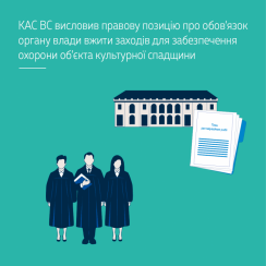 Колегія суддів у складі Касаційного адміністративного суду врахувала, що в частинах 4 та 5 ст. 54 Конституції України визначено, що культурна спадщина охороняється законом. Зокрема, держава забезпечує збереження історичних пам’яток та інших об’єктів, що становлять культурну цінність.