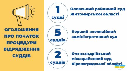Судді, які виявили бажання бути відрядженими до Олевського районного суду Житомирської області, повинні подати зазначені документи до 30 липня 2021 року, а судді, які виявили бажання бути відрядженими до Першого апеляційного адміністративного суду та Олександрійського міськрайонного суду Кіровоградської області, такі документи до Вищої ради правосуддя повинні подати протягом десяти днів (з дня оголошення про початок процедури відрядження суддів).