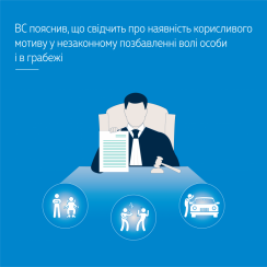 Засуджений за незаконне позбавлення волі особи, грабіж та незаконне заволодіння транспортним засобом (ч. 2 ст. 146, ч. 1 ст. 186, ч. 3 ст. 289 КК України) подав касаційну скаргу до Верховного Суду на судові рішення щодо нього. Скаржник зазначив, зокрема, про неправильну кваліфікацію його дій за ч. 2 ст. 146, ч. 1 ст. 186 КК України у зв’язку з недоведеністю корисливого мотиву на заволодіння майном і на позбавлення волі потерпілого (вважає, що його дії слід кваліфікувати за ч. 1 ст. 146 КК України).