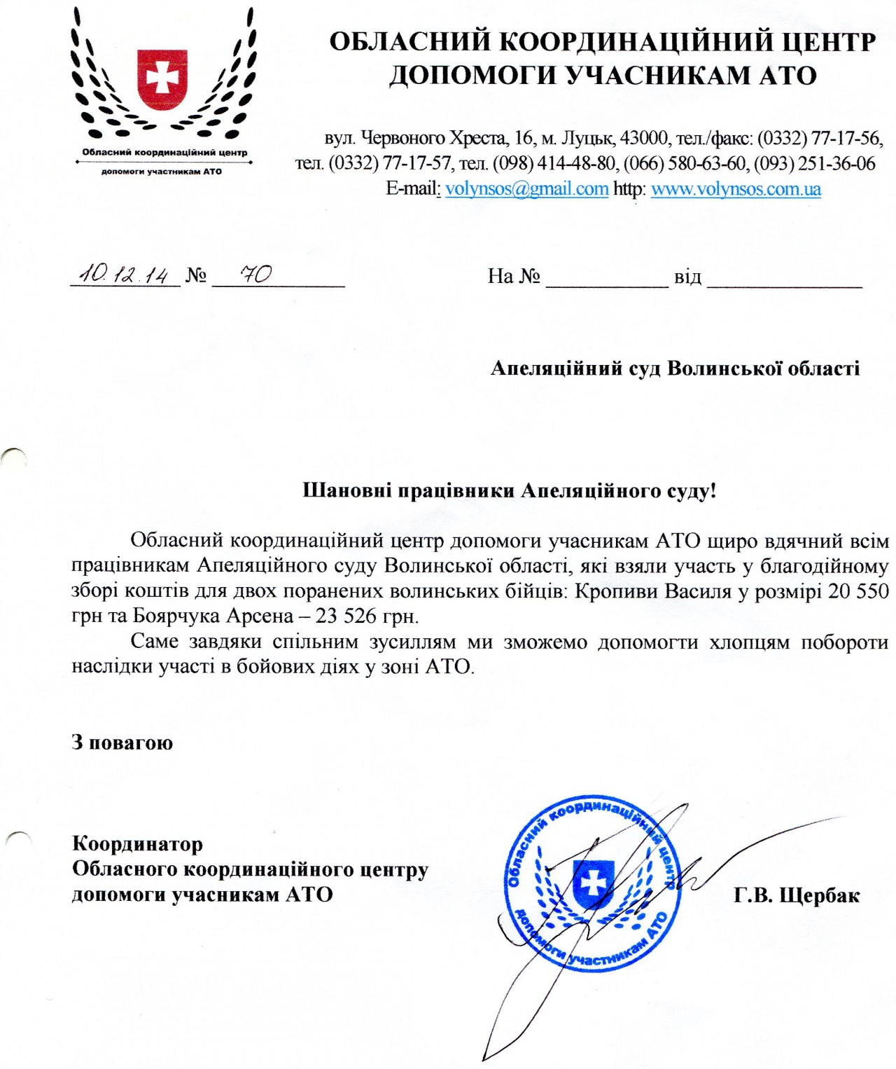 Колективом апеляційного суду Волинської області вкотре надану допомогу