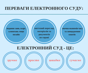 - Електронний суд як майбутня складова ЄСІТС – це один з важливіших публічних сервісів для громадян, оскільки передбачає новий раніше відсутній функціонал – можливість громадянам дистанційно (в електронному вигляді), не виходячи з дому чи перебуваючи в іншому віддаленому від суду місця, подавати позови до суду та отримувати в зворотному порядку від суду процесуальні документи.